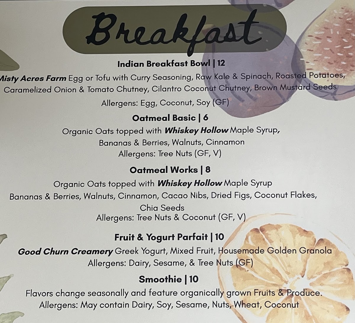 For something heartier, the Oatmeal cannot be missed. It's a cozy bowl of organic oats topped with bananas, berries, and a drizzle of Whiskey Hollow Maple Syrup that is simply irresistible. Each bite is a warm hug that sets the perfect tone for your day.