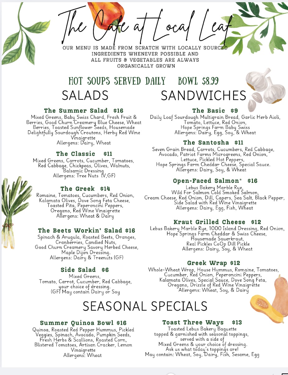 Whether you're looking for a quick bite, a leisurely breakfast with friends, or a refreshing salad on-the-go, The Cafe at Local Leaf Market offers an experience that goes beyond mere dining – it’s about nourishing your body and soul. Stop by to explore their delightful menu, and see for yourself why this cafe is fast becoming a beloved local favorite.